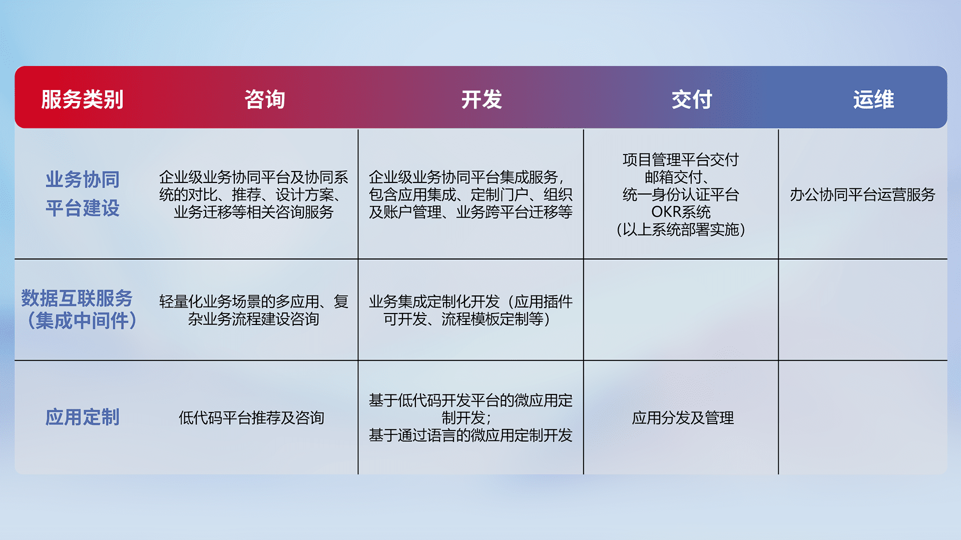 针对钉钉、、、企微、、IDaas等平台级产品提供产品的规划、、、方案、、、交付、、、、定制化开发等服务,,实现如统一协同办公、、智能客户服务、、、混合会议管理、、、、智能数据查询、、、、等业务场景,,实现数字化转型。。。